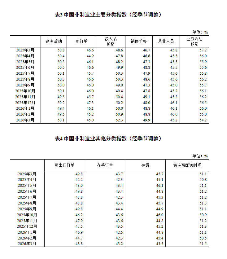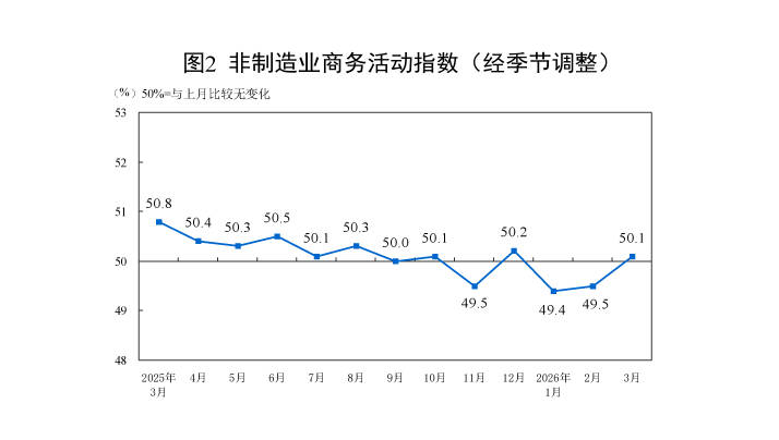 两、华夏非制作业推销司理指数运转环境 3月份,非制作业商务举动指数为50.1%,比上月高潮0.6个百分面,下于临界面,非制作业景气呼呼火仄有所改良。